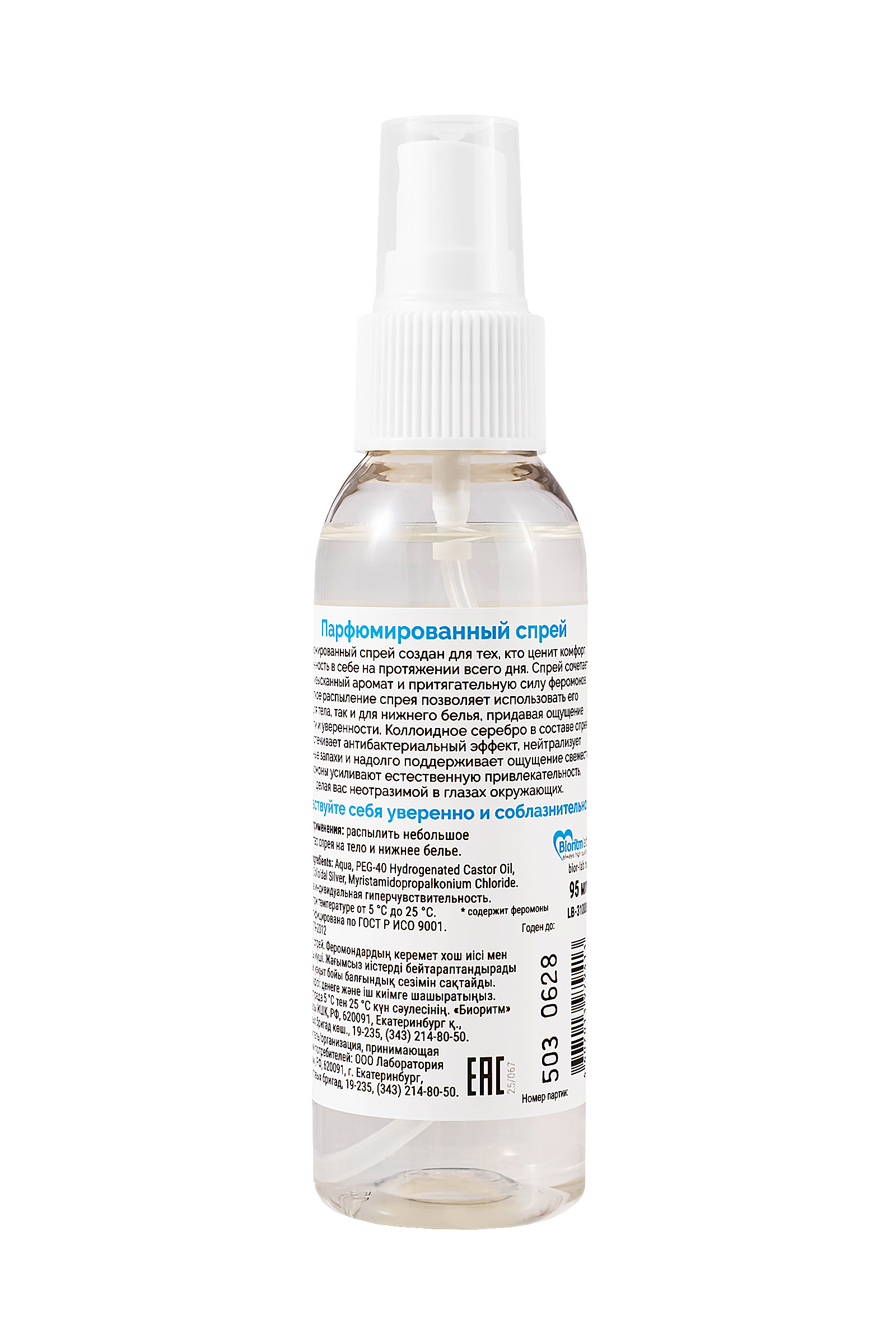 Aqua, PEG-40 Hydrogenated Castor Oil, Parfum, Colloidal Silver, Myristamidopropalkonium Chloride. Содержит феромоны.